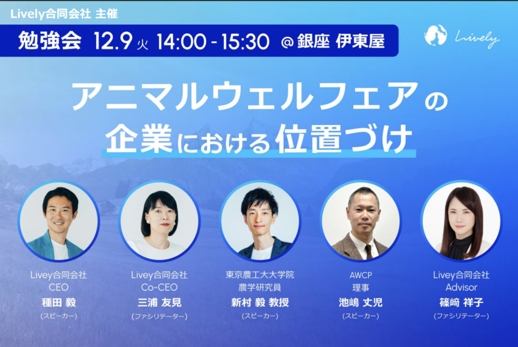 2025年12月9日、Lively合同会社様からのご依頼を受け、メディア向けに開催されたアニマルウェルフェア勉強会に登壇いたしました。日程の都合により、代表の上原に代わって今回は池嶋が務めさせていただきました。
