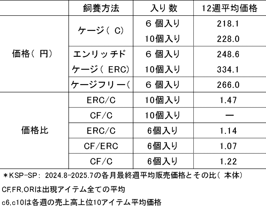 ケージフリーはケージ卵に対して、10個入りで約2倍前後、6個入りで約1.5倍前後の価格水準が観測されました。