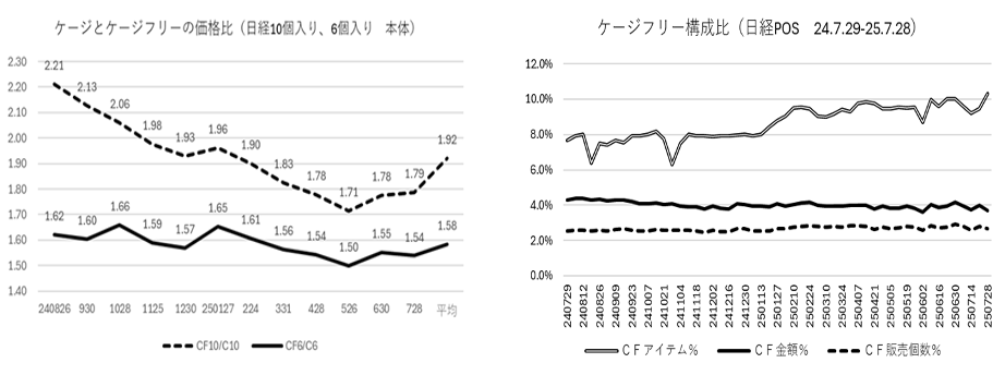 - 日経POS(首都圏):ケージフリー販売金額は2.46倍、販売金額シェアは2.1%→4.0%へ上昇